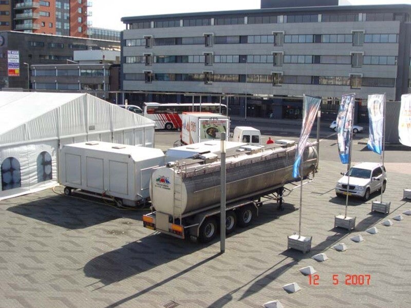 Deze trailer word altijd afgeleverd met een gevuld spoelwater compartiment wat dus neerkomt op een terrein gewicht van circa 27 Ton u dient er dus rekening mee te houden dat de ondergrond waarop de trailer geplaatst dient te worden voldoende stevigheid bied om dit gewicht te dragen.